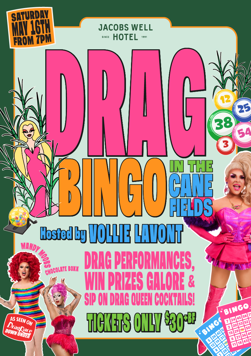 Get ready to sashay your way to the Cane Fields at Jacobs Well Hotel for a night of dazzling entertainment! SATURDAY MAY 16, is about to get a whole lot more colourful with Drag Bingo!