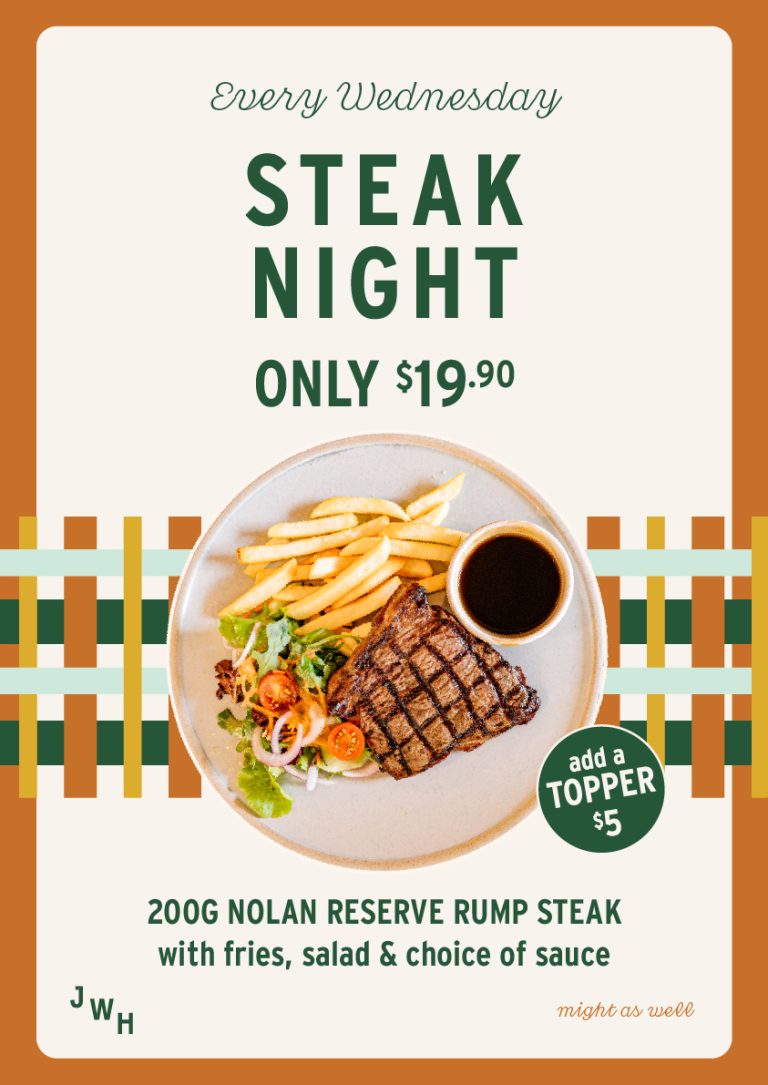 Wednesday night just got a whole lot better with our Steak Night special! Join us every week to enjoy juicy 200g Nolan Reserve Rump with fries, salad and your choice of sauce for just $19.90.